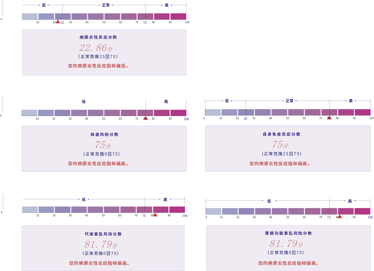 评估结果:病原炎性反应指数偏低、自身免疫反应指数偏高、体虚指数偏高、 肠胃功能紊乱中高风险、肝功能损伤中高风险